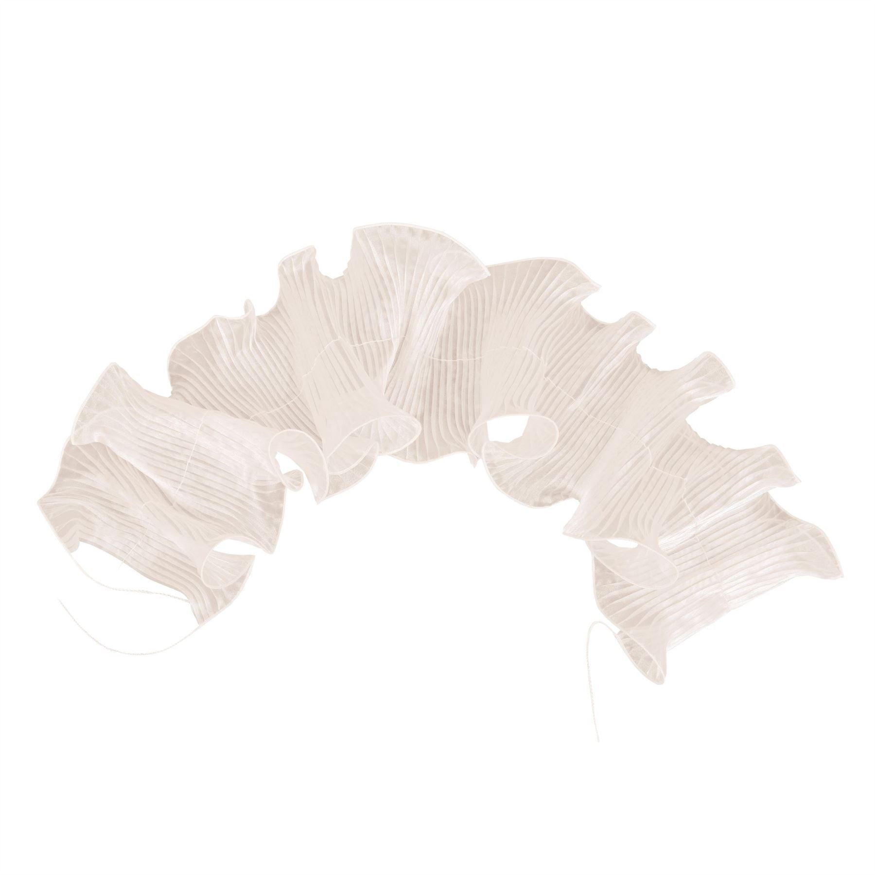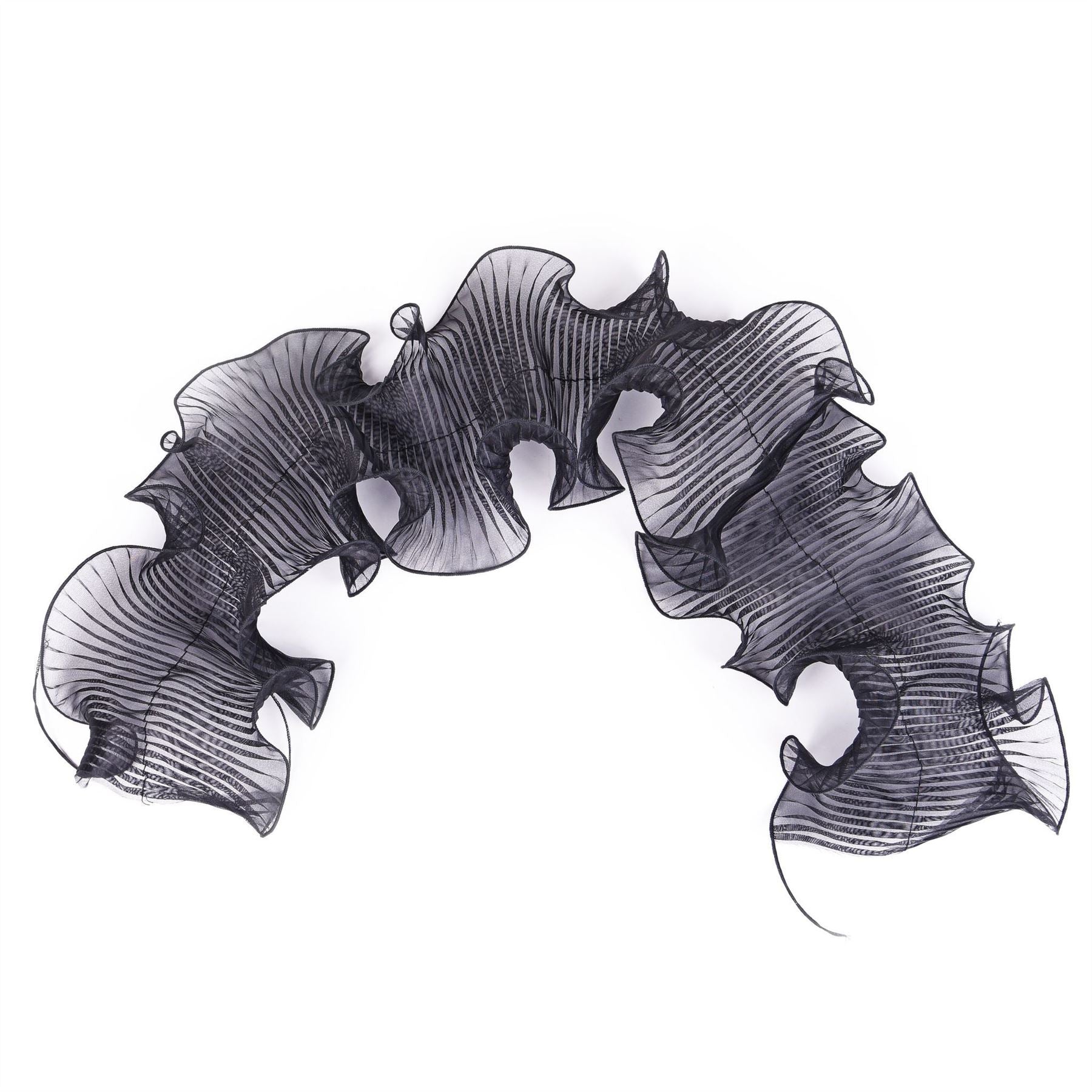 1. Overlocked edge pleated organza shush trim 2. 18cm wide 3. 90cm long. Pleated organza shush trim with overlocked edging and an elegant shimmer effect to material giving a quality finish, ideal for many fascinators, millinery and hat trims.