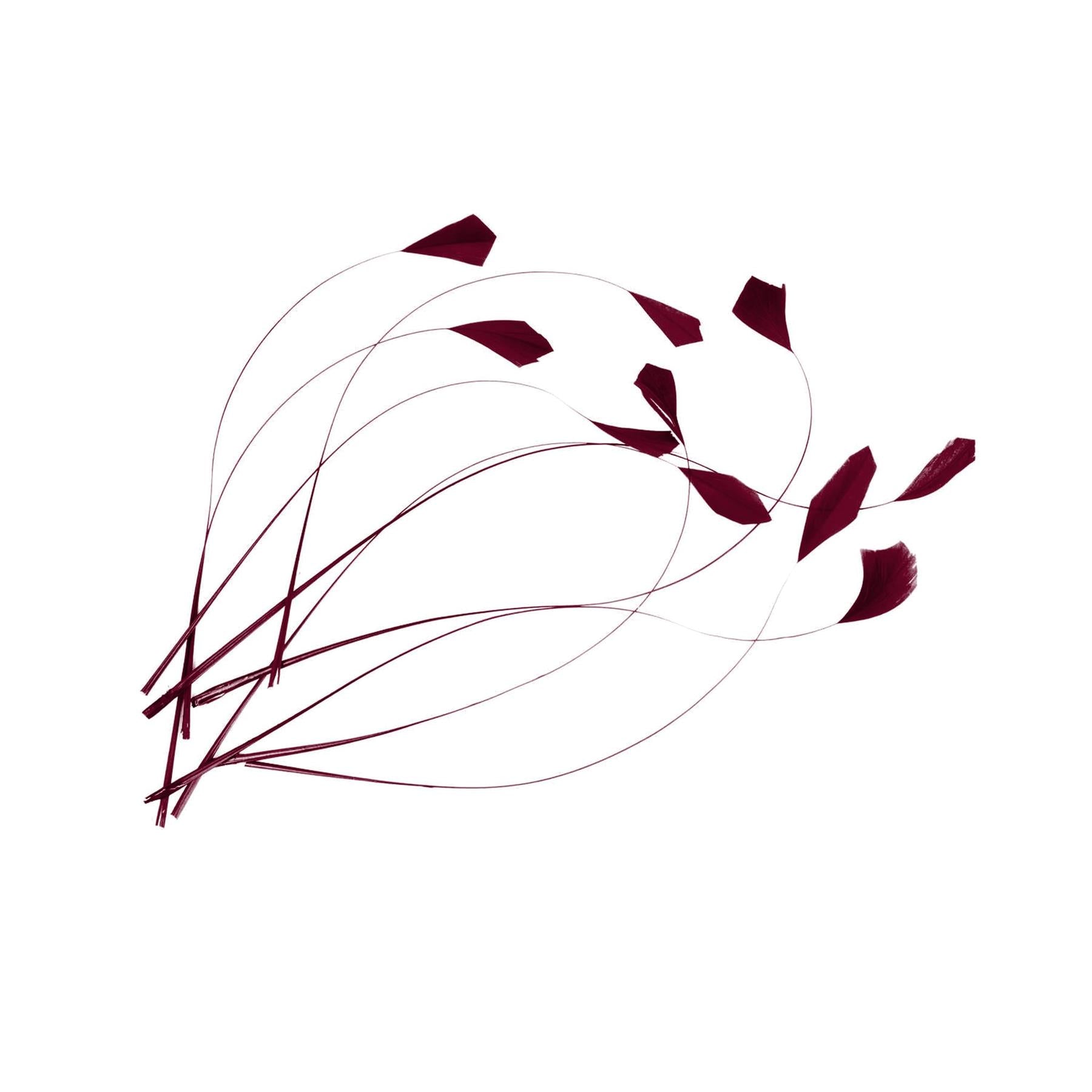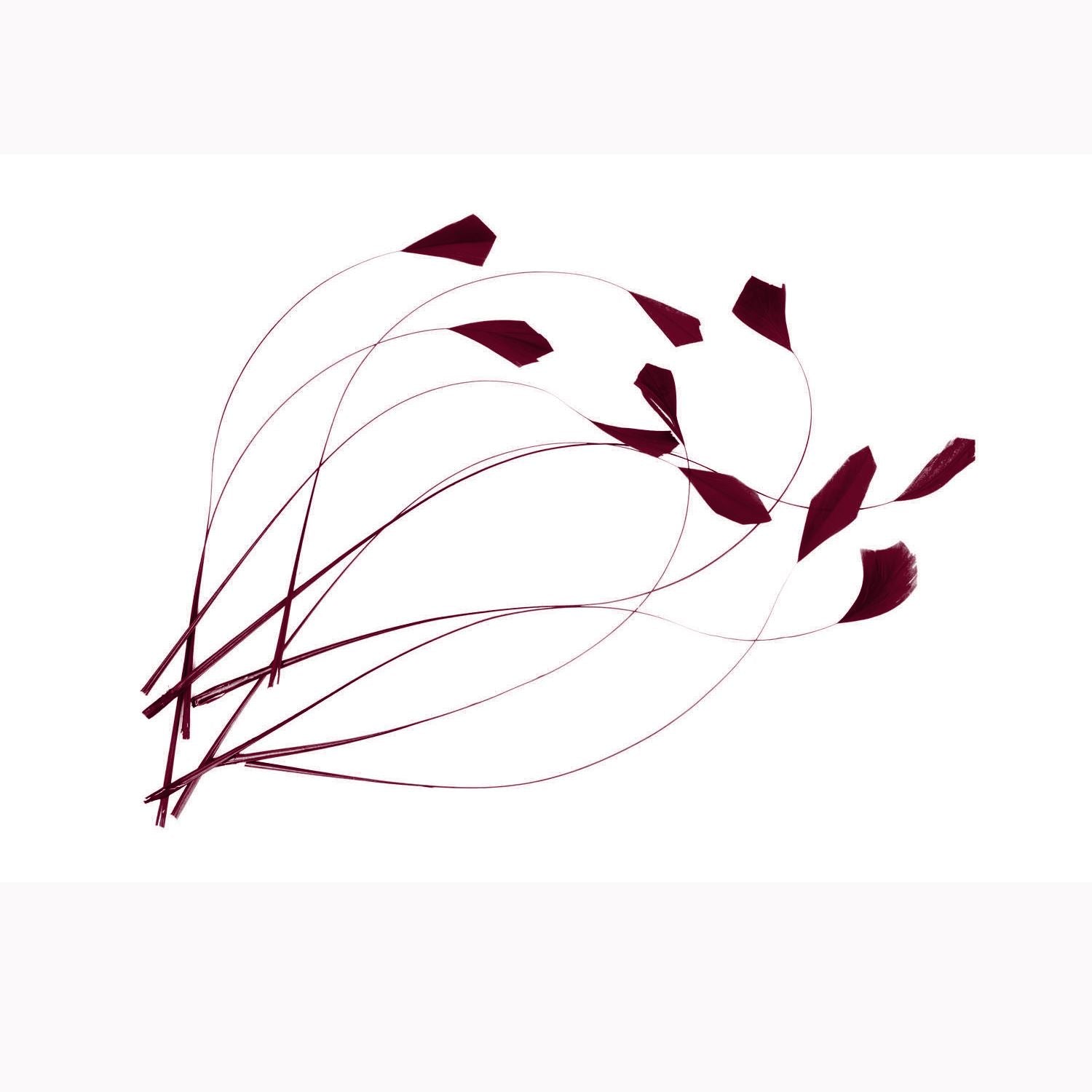 Extremely delicate coq feather teardrop tips on fine feather spines giving a flowing and drooping head, a classic feather accompaniment to any hat, fascinator or millinery creation. A staple for all milliners. Available in a range of classic colours. 5 feathers measuring 18 to 20cm in length, feather heads 1cm long by 1cm wide, bundled and glued together with matching dyed craft paper.