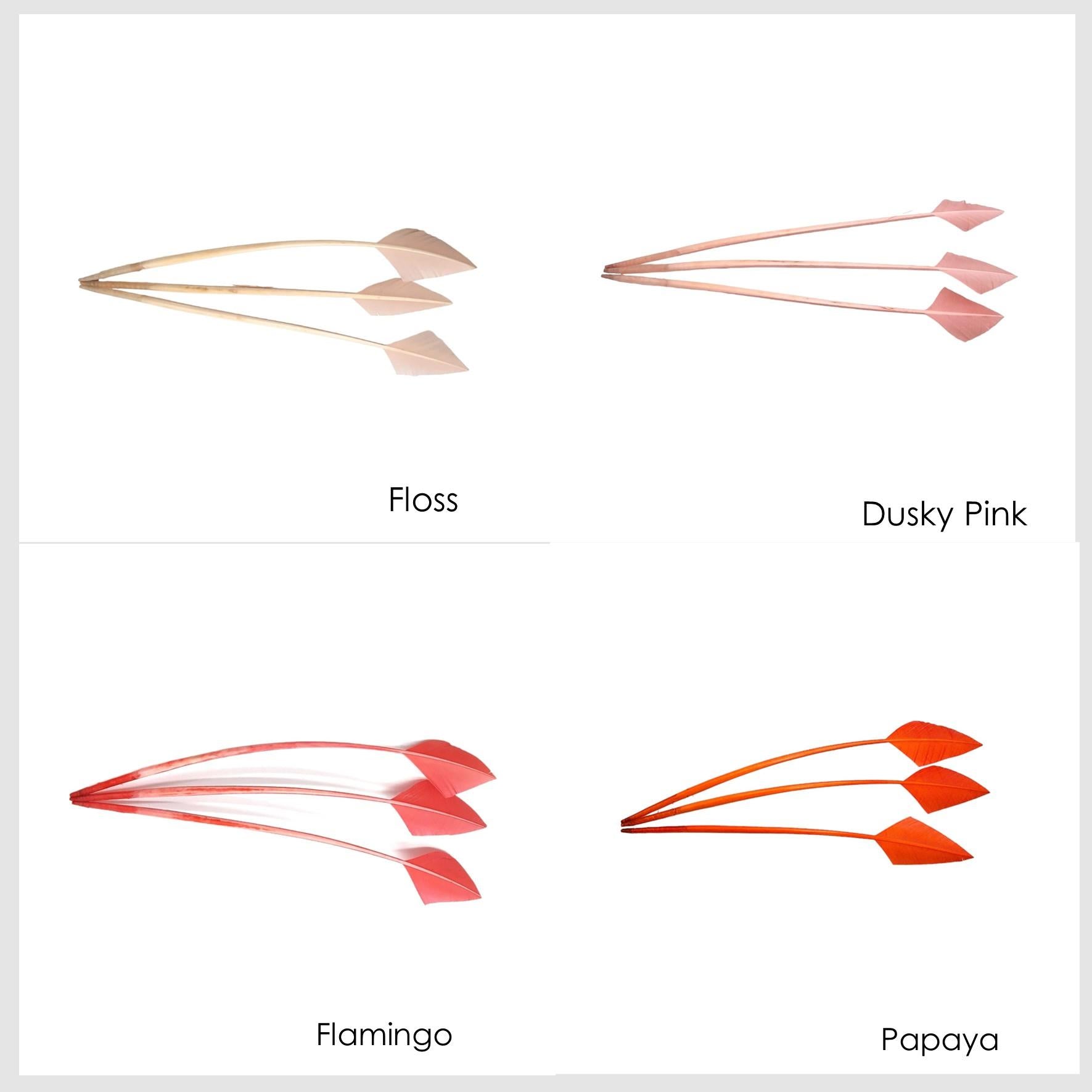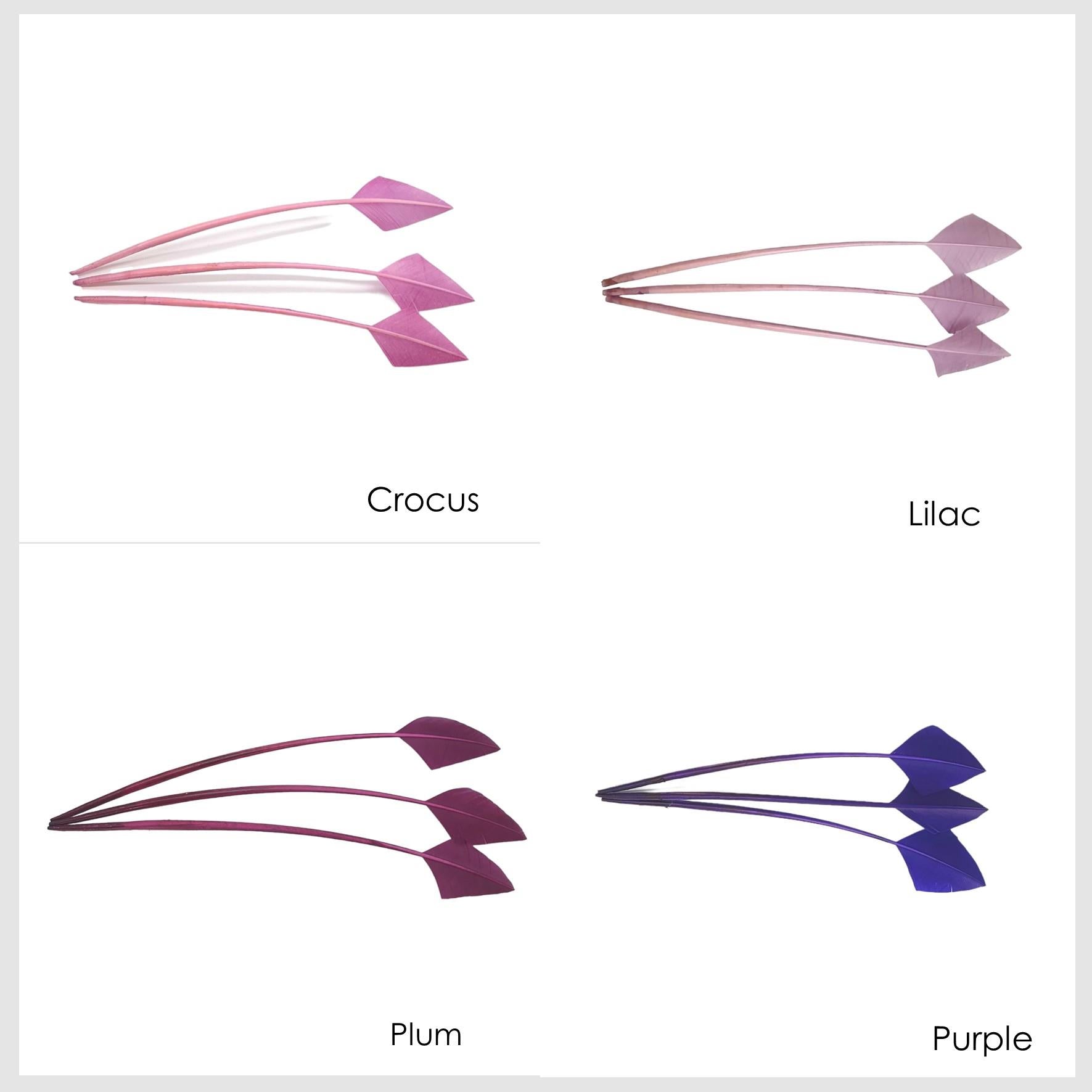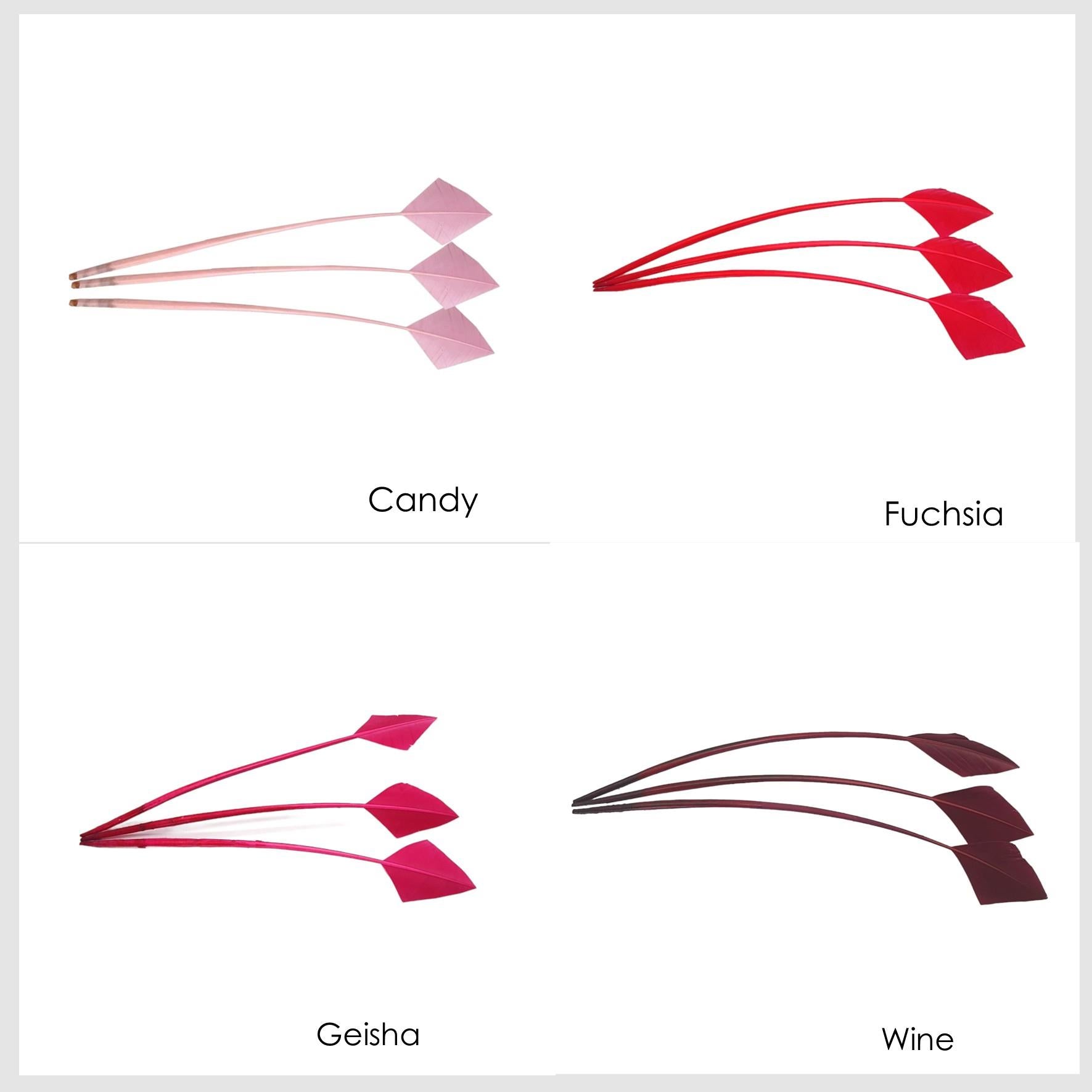 A staple feather for many milliners, fascinator creators and for craft use. Three turkey wing feathers, stripped to the central spine leaving an elegant diamond shaped head. Remember you can cut this head to some alternate shapes, don't just rely on our finish, and don't forget they're wing feathers, they bend both directions. A great range of colours covering a majority of our running pallet. These feathers measure up to 35cm long and heads can be 4 or 5cm wide. Sold in bundles of 3pcs.