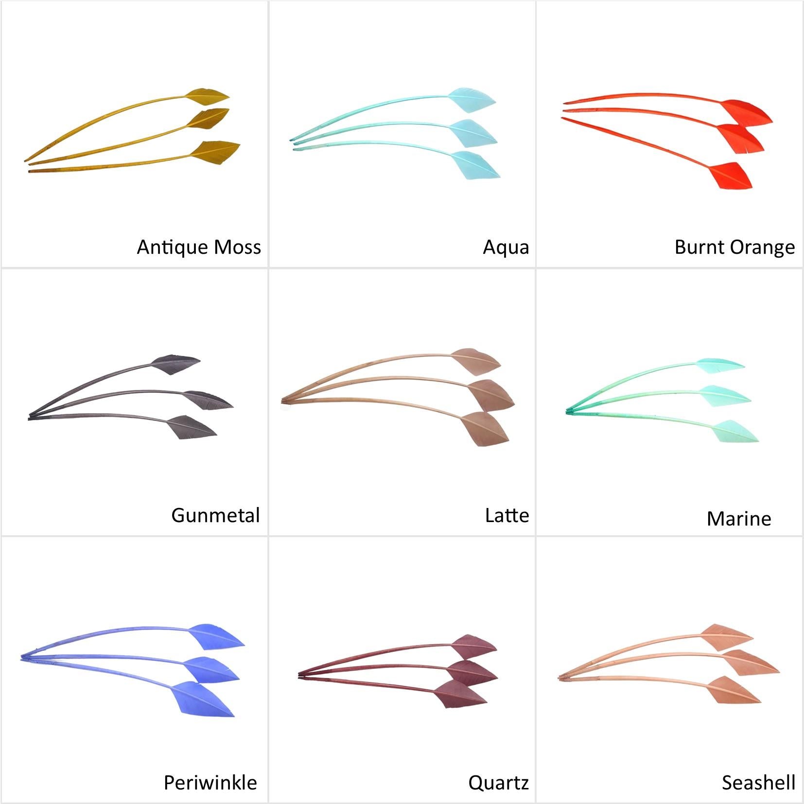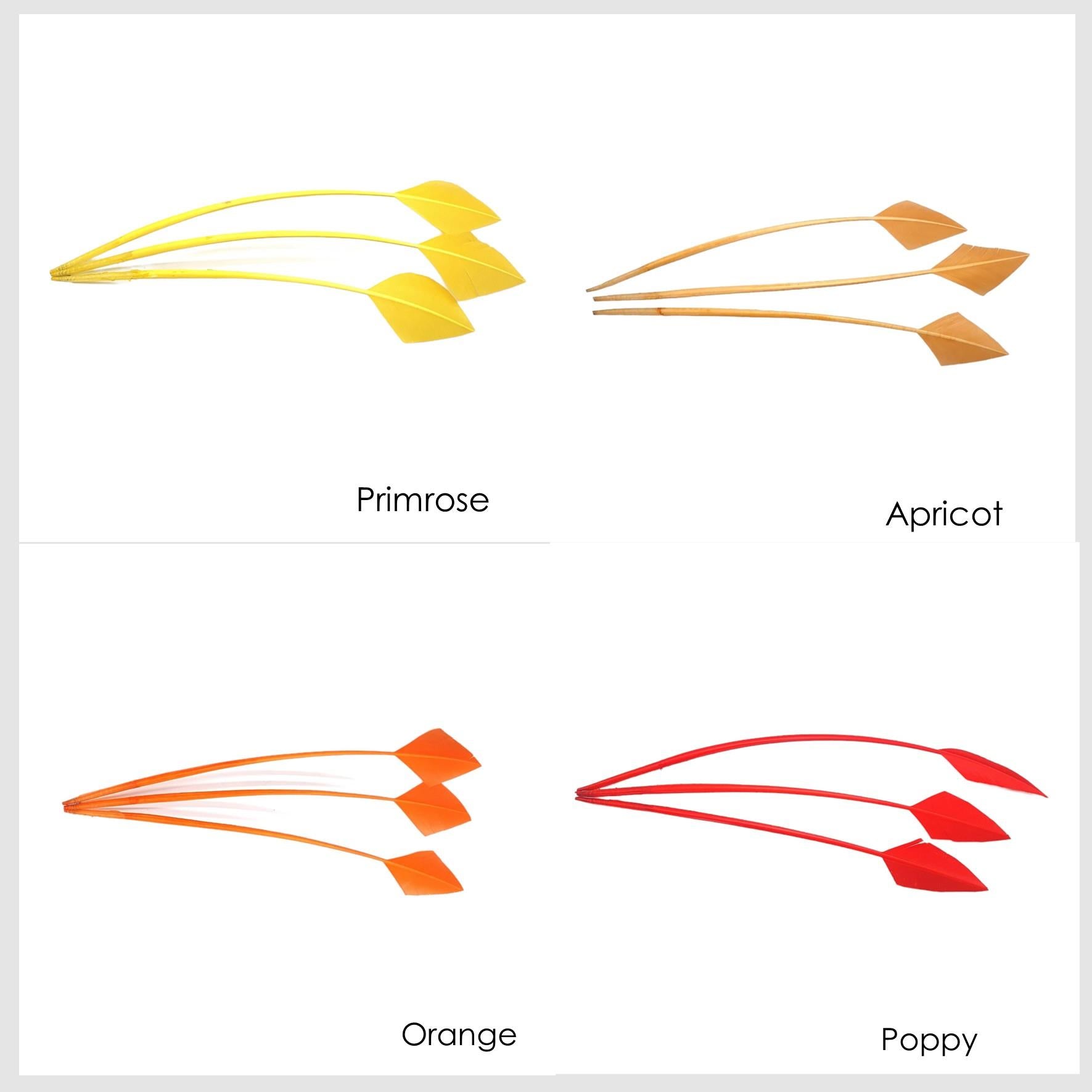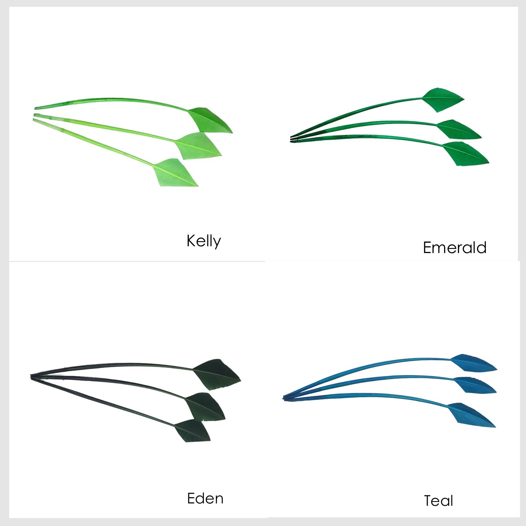 A staple feather for many milliners, fascinator creators and for craft use. Three turkey wing feathers, stripped to the central spine leaving an elegant diamond shaped head. Remember you can cut this head to some alternate shapes, don't just rely on our finish, and don't forget they're wing feathers, they bend both directions. A great range of colours covering a majority of our running pallet. These feathers measure up to 35cm long and heads can be 4 or 5cm wide. Sold in bundles of 3pcs.