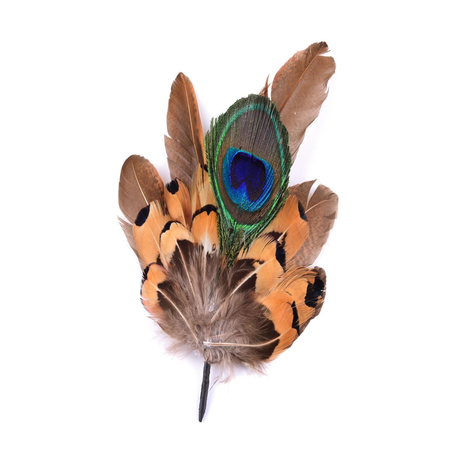 1. 15cm high 2. Pea eye 3. Assorted feathers. A selection of pheasant body and small wing feathers topped of with a beautiful pea eye, this is a medium sports and hat mount available in natural colours and measures around 15cm in length and 10cm wide