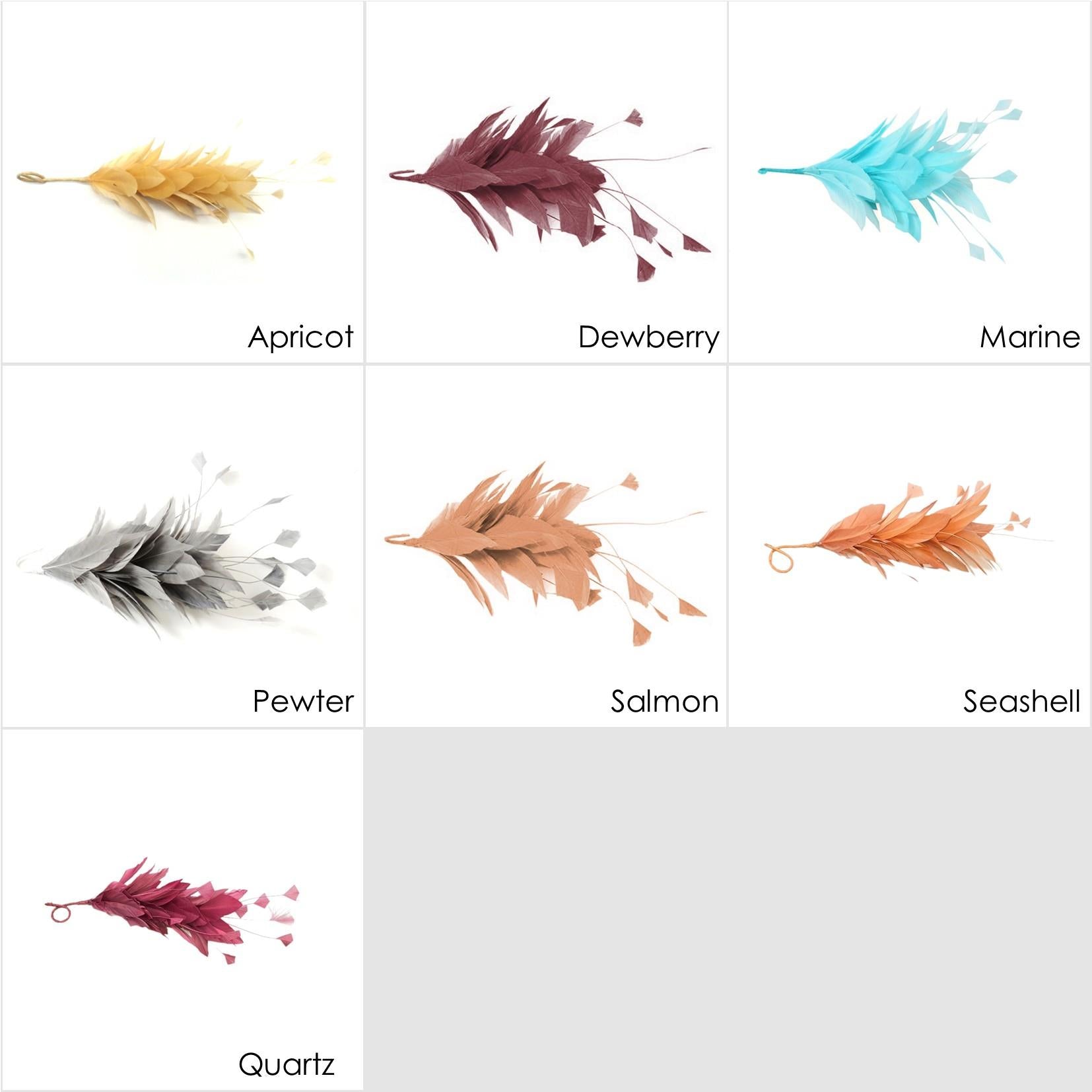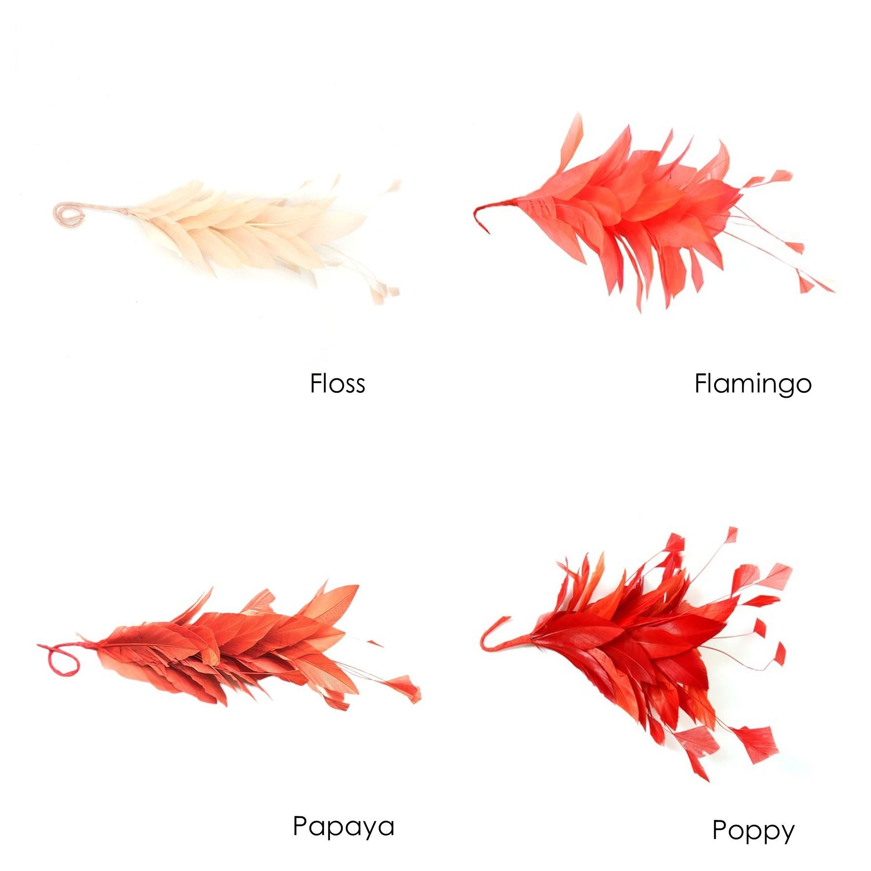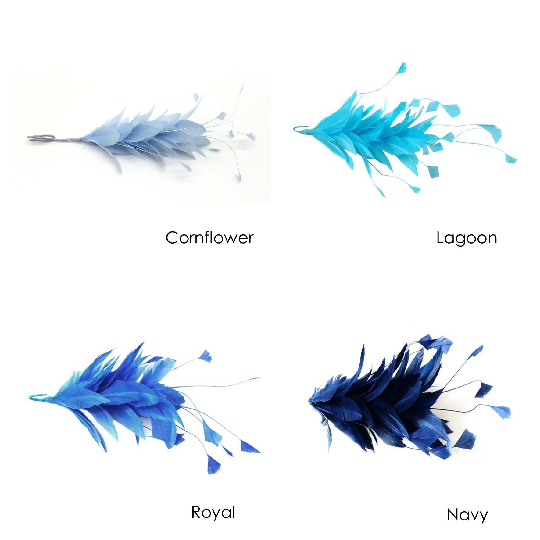 Brilliantly versatile goose feather mount with random delicate stripped coq feather heads mounted onto craft wire giving you the ability twist into bends and circles, it runs in a great range of colours covering a majority of our running pallet and measures up to 15cm long and 10cm wide.