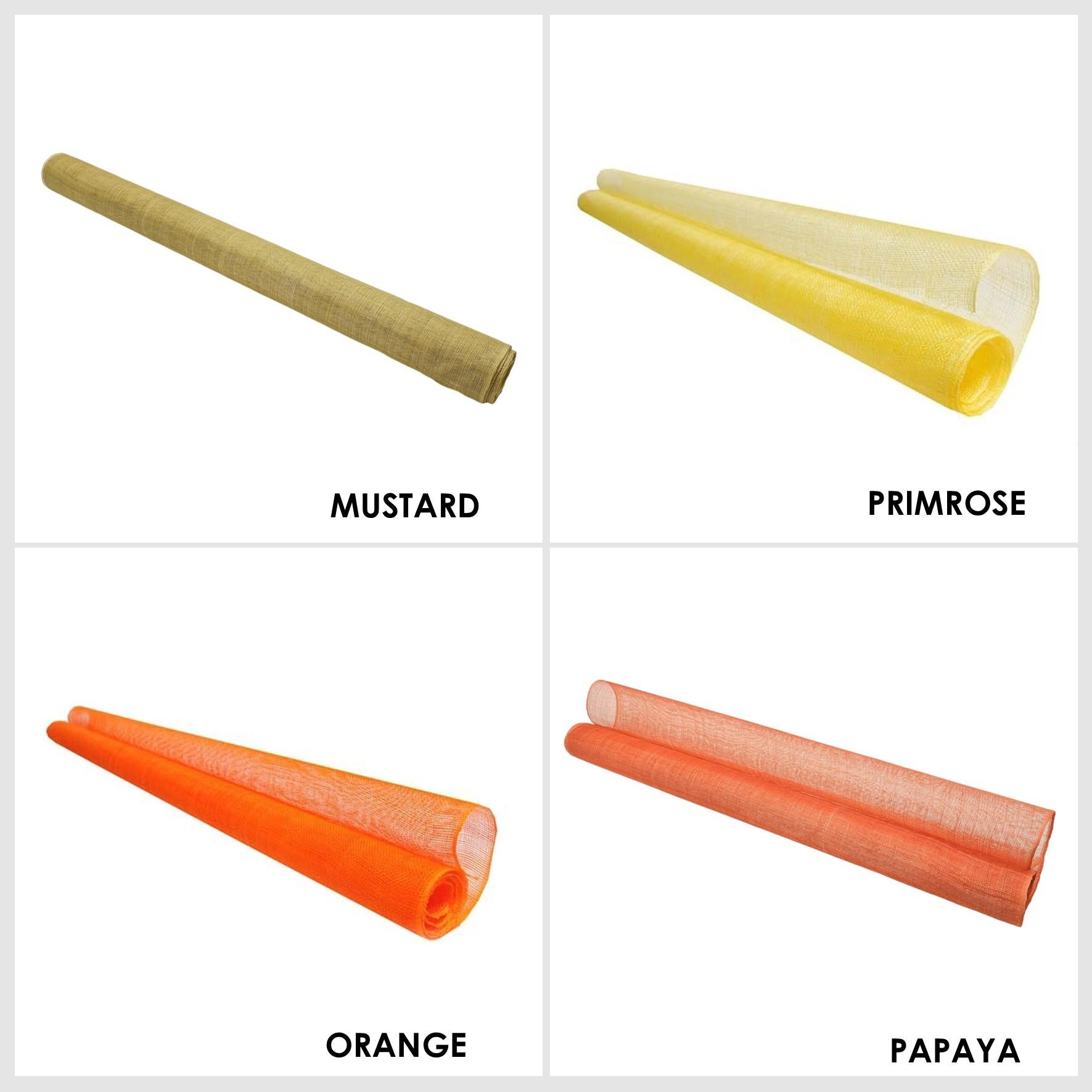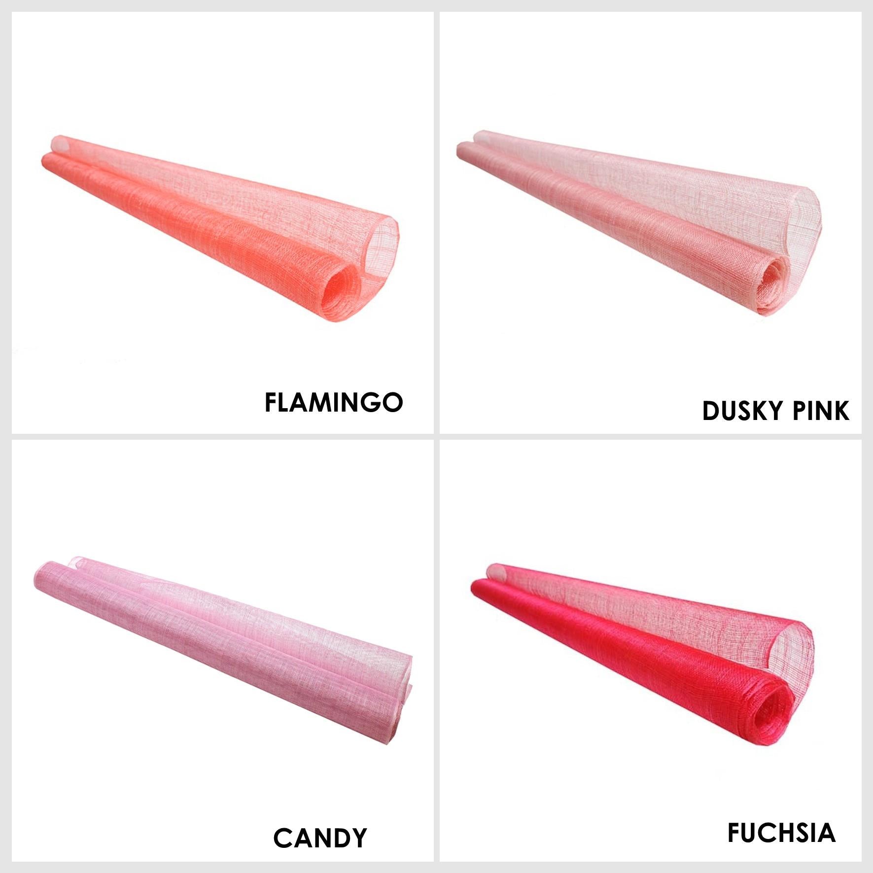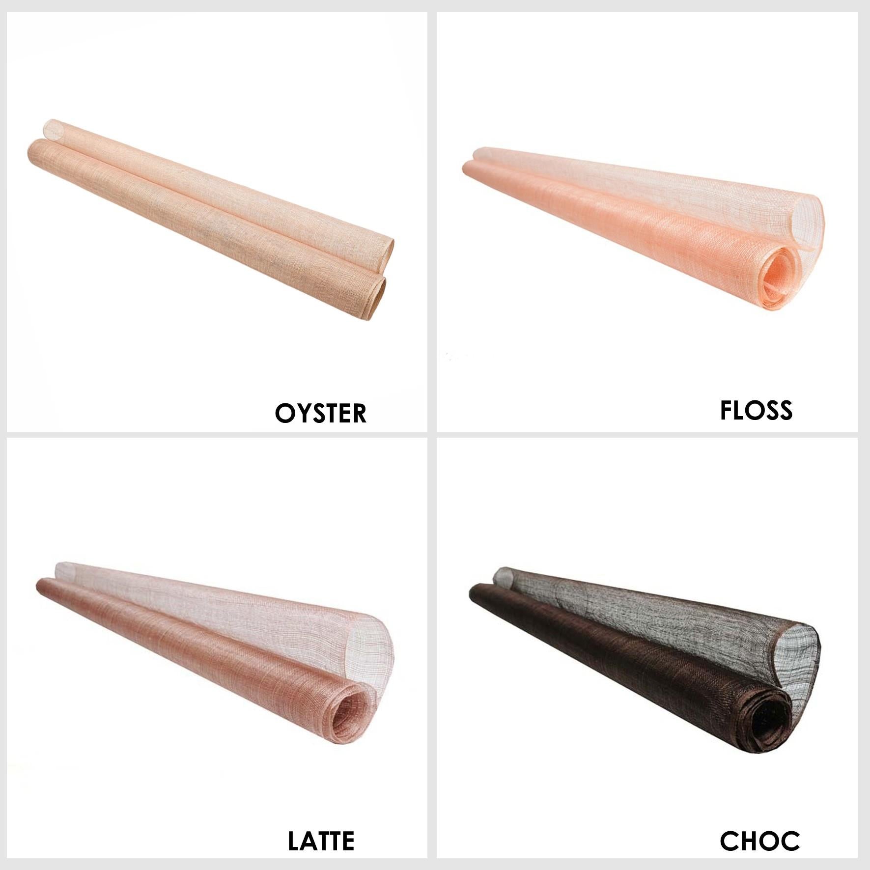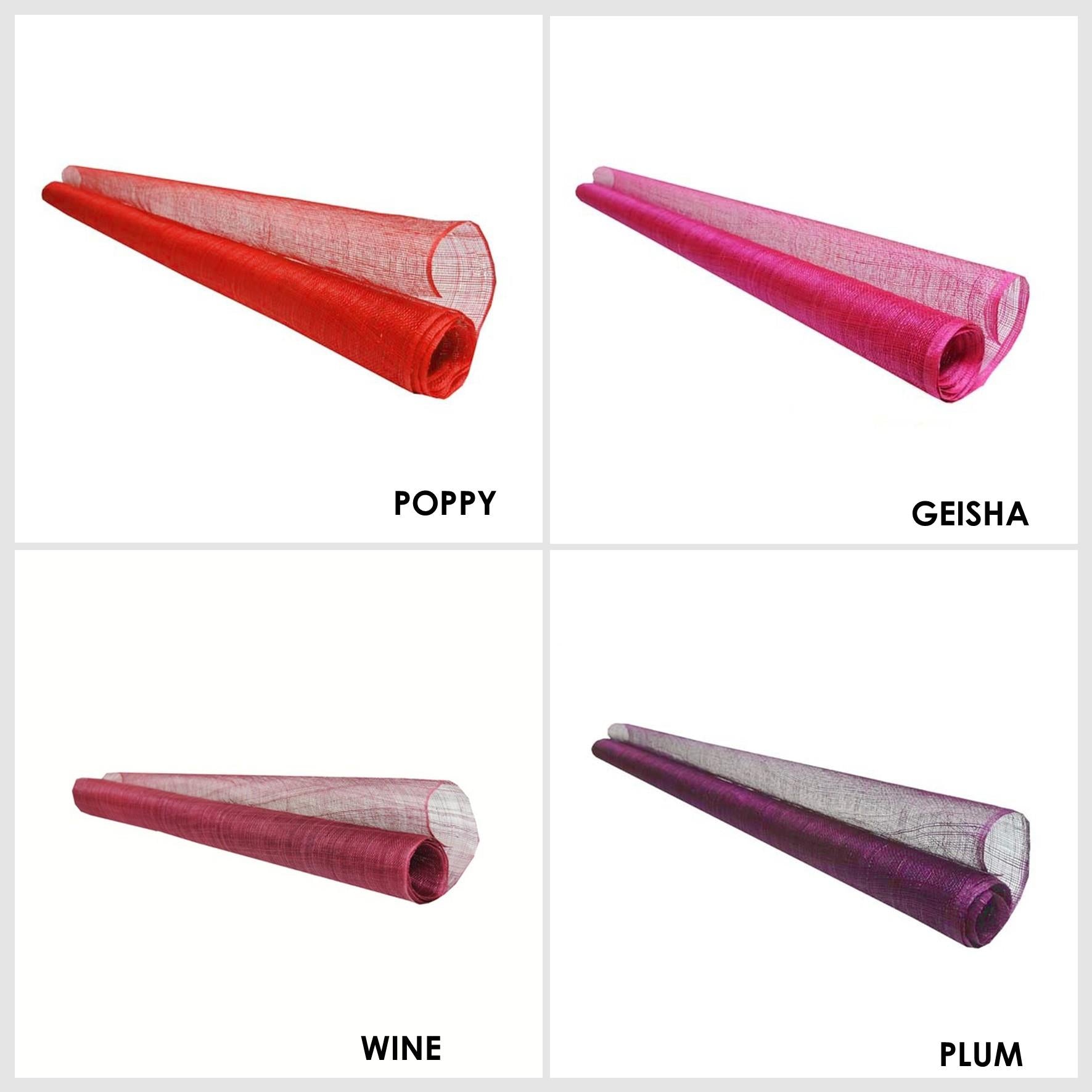 Sinamay fabric, probably the most used material for creating many millinery creations hats and fascinators. This fabric made from the fine fibres of the abaca tree are hand selected and woven carefully together to form this material. Woven only on machines rather than by hand, this sinamay is the most consistent and fault free sinamay you can find. The selection process and careful weaving produces a sinamay with very little flaws, knots and weave faults always found in hand woven sinamay. A medium stiffener finish is applied to allow this material to be used both in making hats and millinery ideas and also as a trim, the results are truly endless. The openness of the weave gives ease of movement and the ideas are endless with this material. A great range of colours covering a majority of our running pallet, this most popular material is sold by the metre and measures 90cm wide. If you require more than one metre we will always supply on continual lengths.