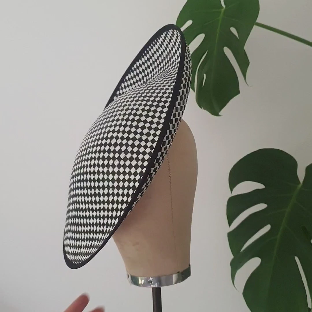 1. Check raffia straw side sweep up brim hat base 2. Approx. 34cm wide 3. Approx. 4cm high. Check raffia straw hat base with side sweep up brim and a matching grosgrain binding, ideal for many fascinators, millinery and hat trims. You will need to add your own headband, comb, clip or elastic to make this fit. Does not come with an inner ribbon band.