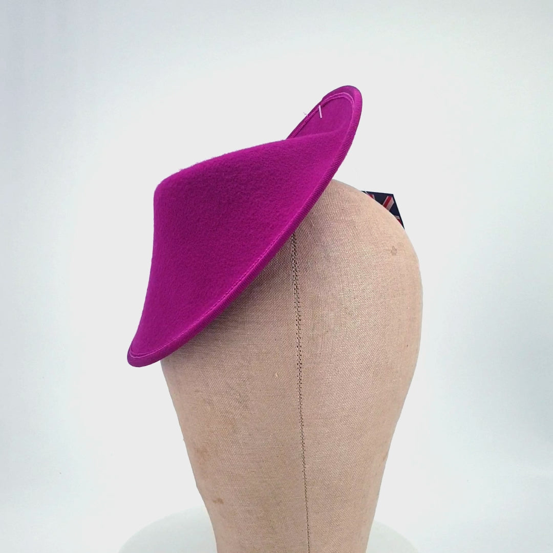 This unusual fascinator base features an elegant side sweep, paired with a sharper half-crown effect. The perfect start to a unique millinery project. It measures approximately 19.5x20cm at it's widest points. You will need to add your own headband, comb, clip or elastic to make this fit. Does not come with an inner ribbon band.