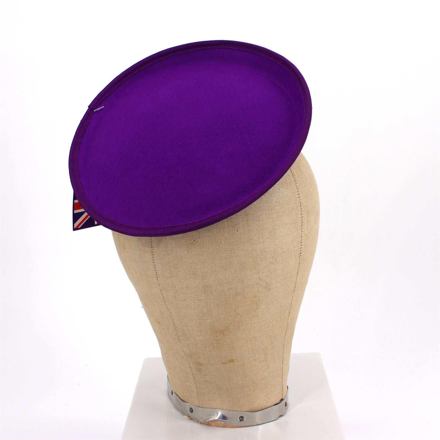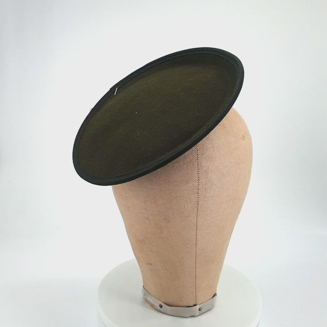 A great fascinator base with a small, but sharp upturned brim at one edge. Simple and sophisticated, this base would be a great base for many millinery designs. Available in a limited edition range of colours. Measures approximately 20cm across and 1cm tall. You will need to add your own headband, comb, clip or elastic to make this fit. Does not come with an inner ribbon band.