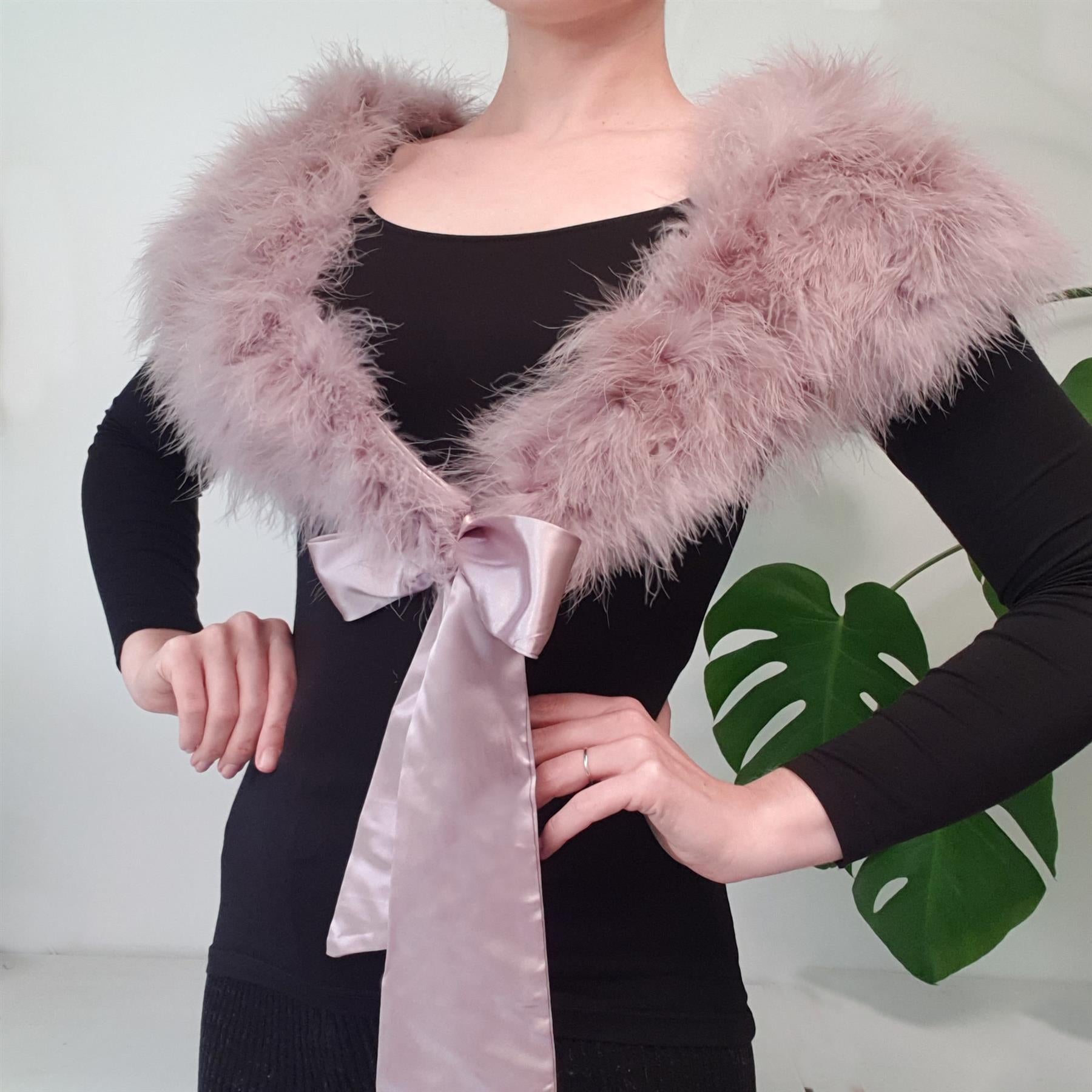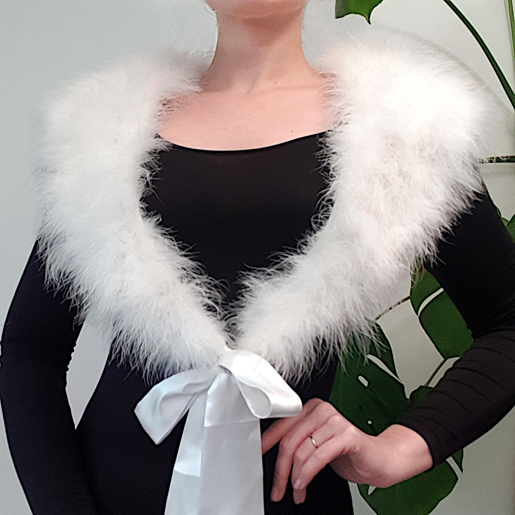Beautiful soft marabou feather shawl with satin lining. Size can fit most, actual measurements are 20cm at its widestx100cm point to pointx52cm each satin tie length. You will need to add your own headband, comb, clip or elastic to make this fit. Does not come with an inner ribbon band.
