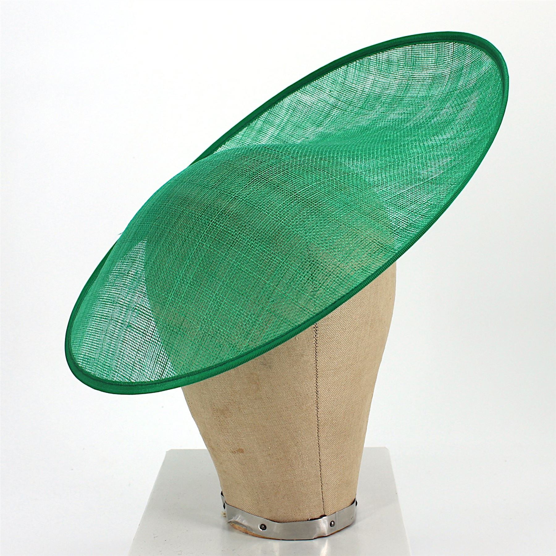 This moderately sized sweeping saucer is a classic choice. This versatile fascinator base is made in the UK from 2 layers of sinamay and finished with a co-ordinating petersham edge. Measures approximately 33x34cm at widest points. You will need to add your own headband, comb, clip or elastic to make this fit. Does not come with an inner ribbon band.