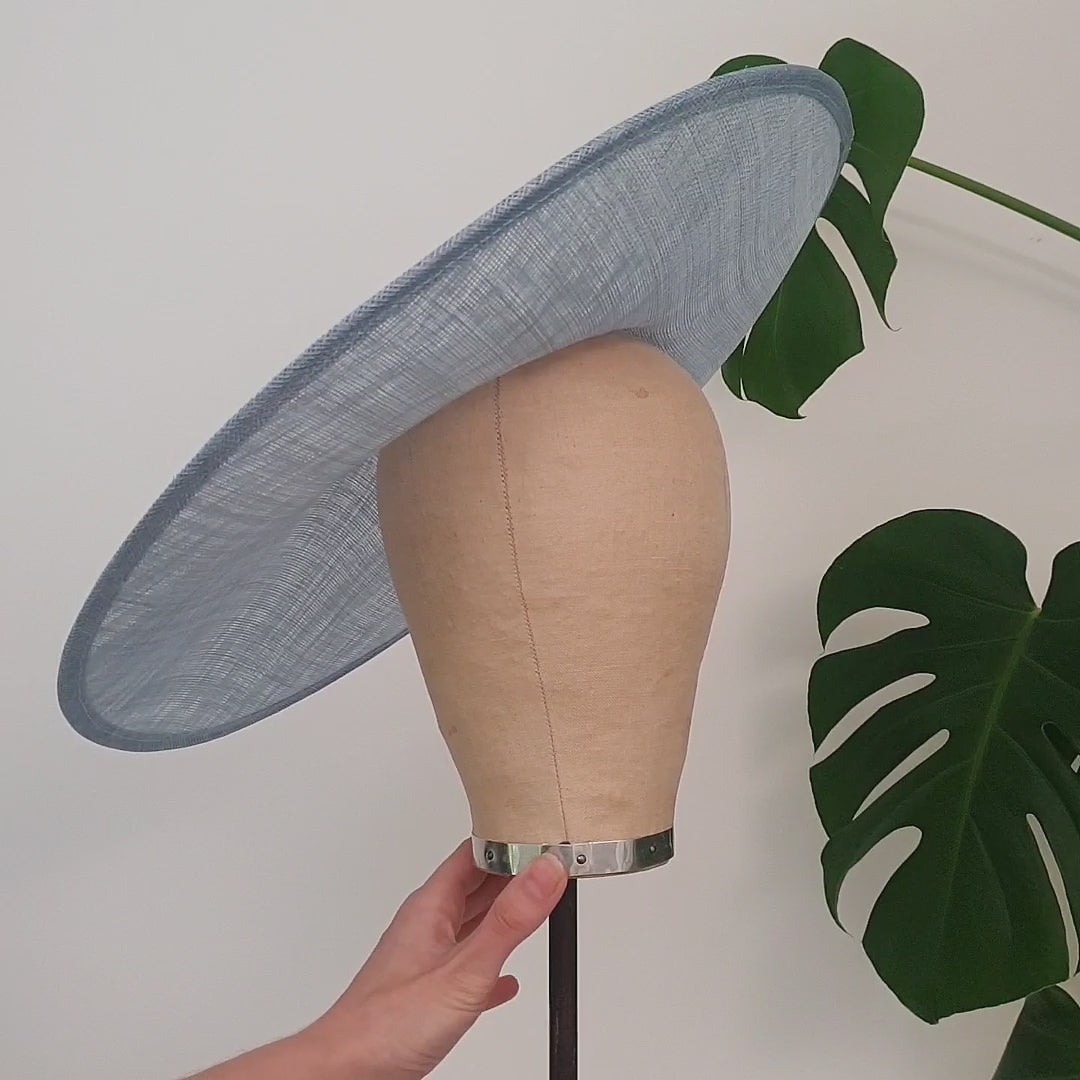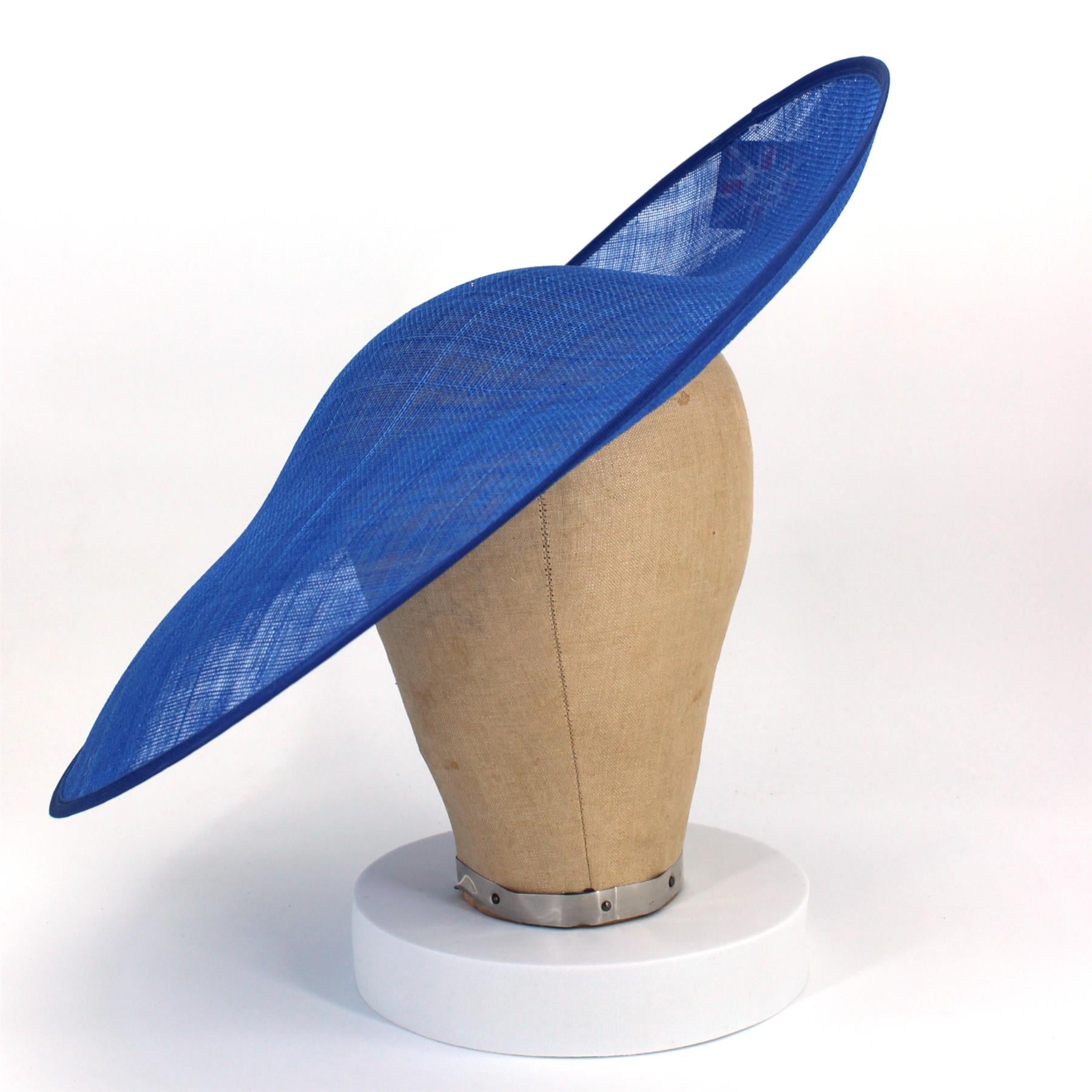 Fabulously large sweeping statement shape, sweeping up on one side and slight drop to the other with a small scalloped crown shape for positioning, this beautifully elegant shape is the base for a fantastic creation UK made from 2 layers of our sinamay and finished with matching petersham ribbon bind. Available in a range of classic colours, this millinery hat base has a diameter of around 44cm and stands about 6cm at its highest. You will need to add your own headband, comb, clip or elastic to make this fit. Does not come with an inner ribbon band.