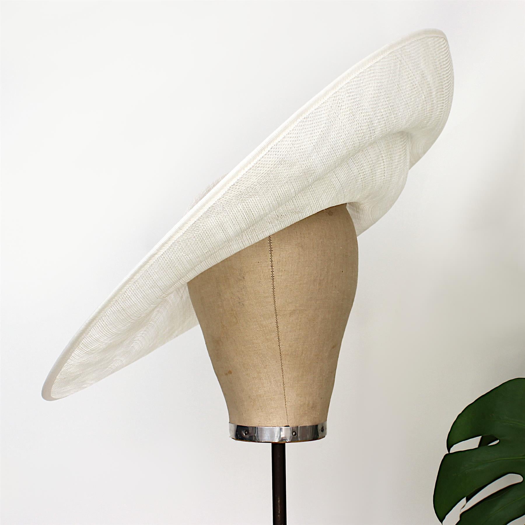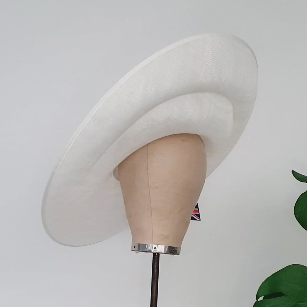 British made premium 3 layer sinamay side sweep with indented brim half way and a smooth rounded crown, wired and turned brim edges, ideal for many fascinators, millinery and hat trims. You will need to add your own headband, comb, clip or elastic to make this fit. Please note these items are bespoke made and are not returnable.