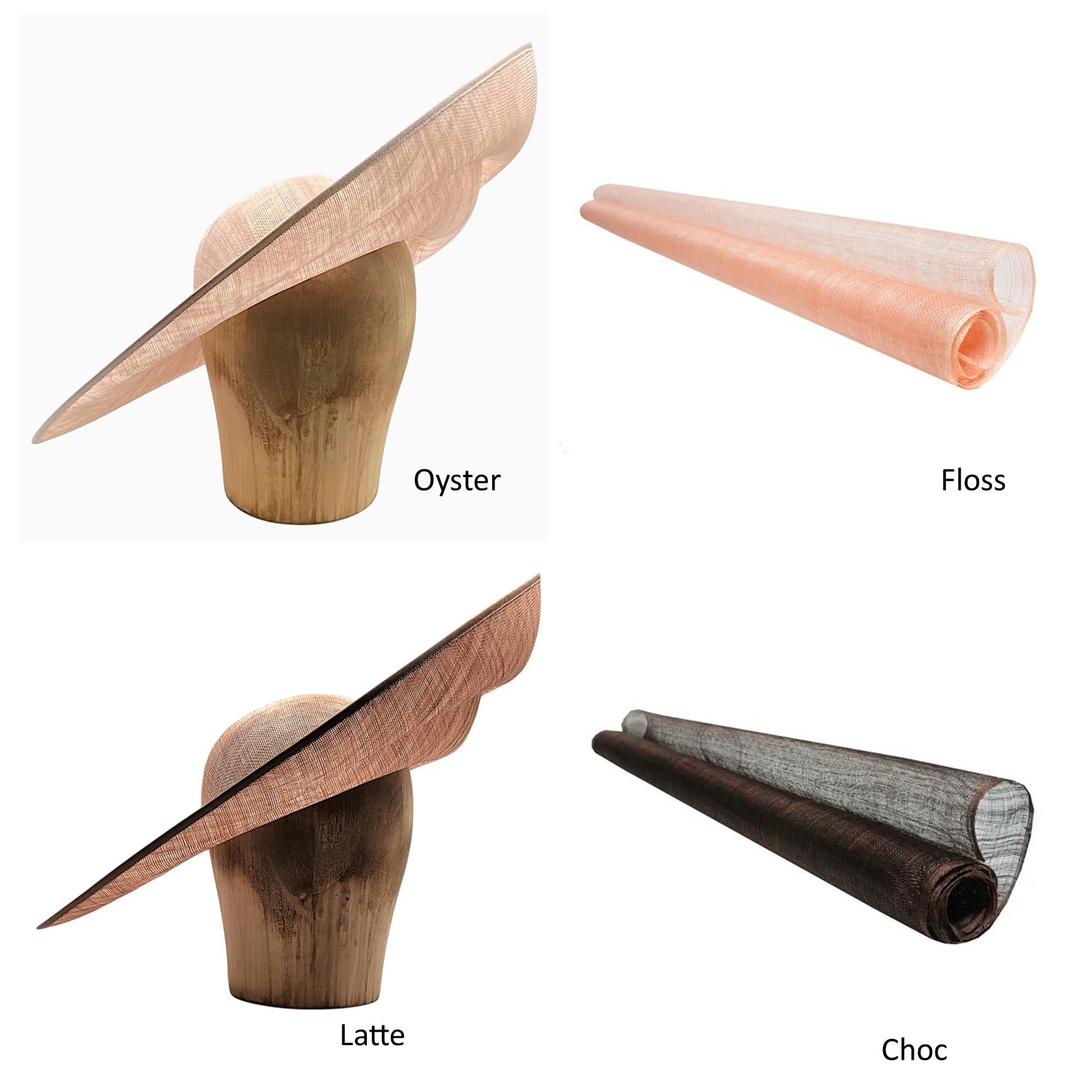 British-made premium 3-layer sinamay side sweeping hat base with a softly contoured crown featuring a subtle side indentation and wired, turned brim edges.
