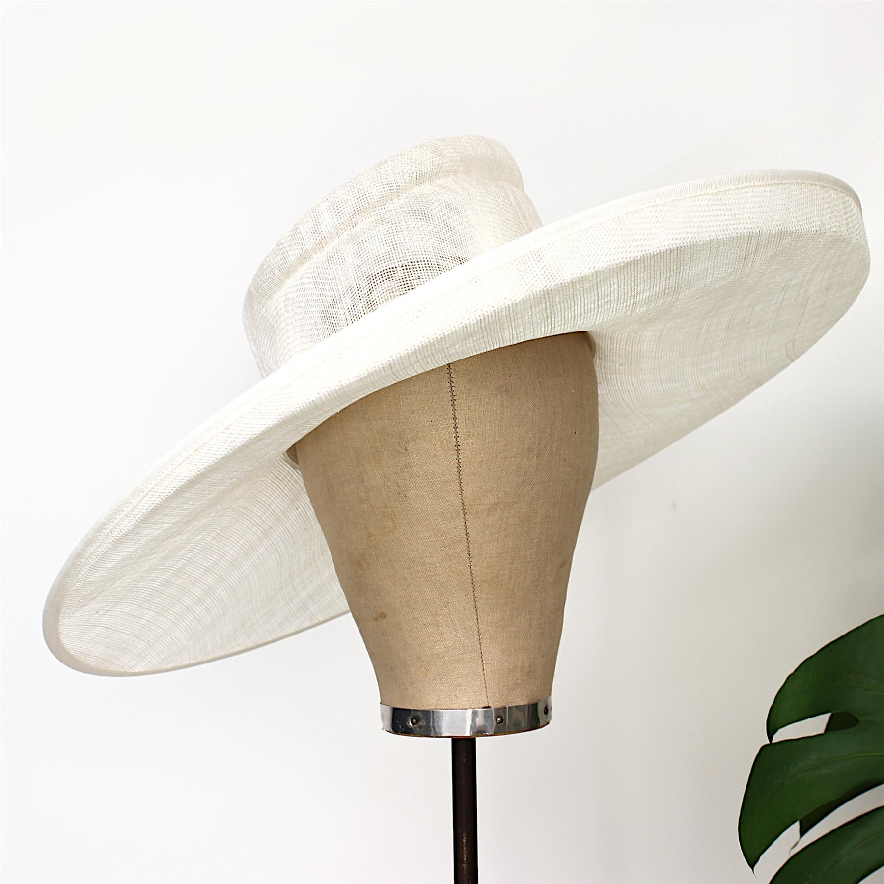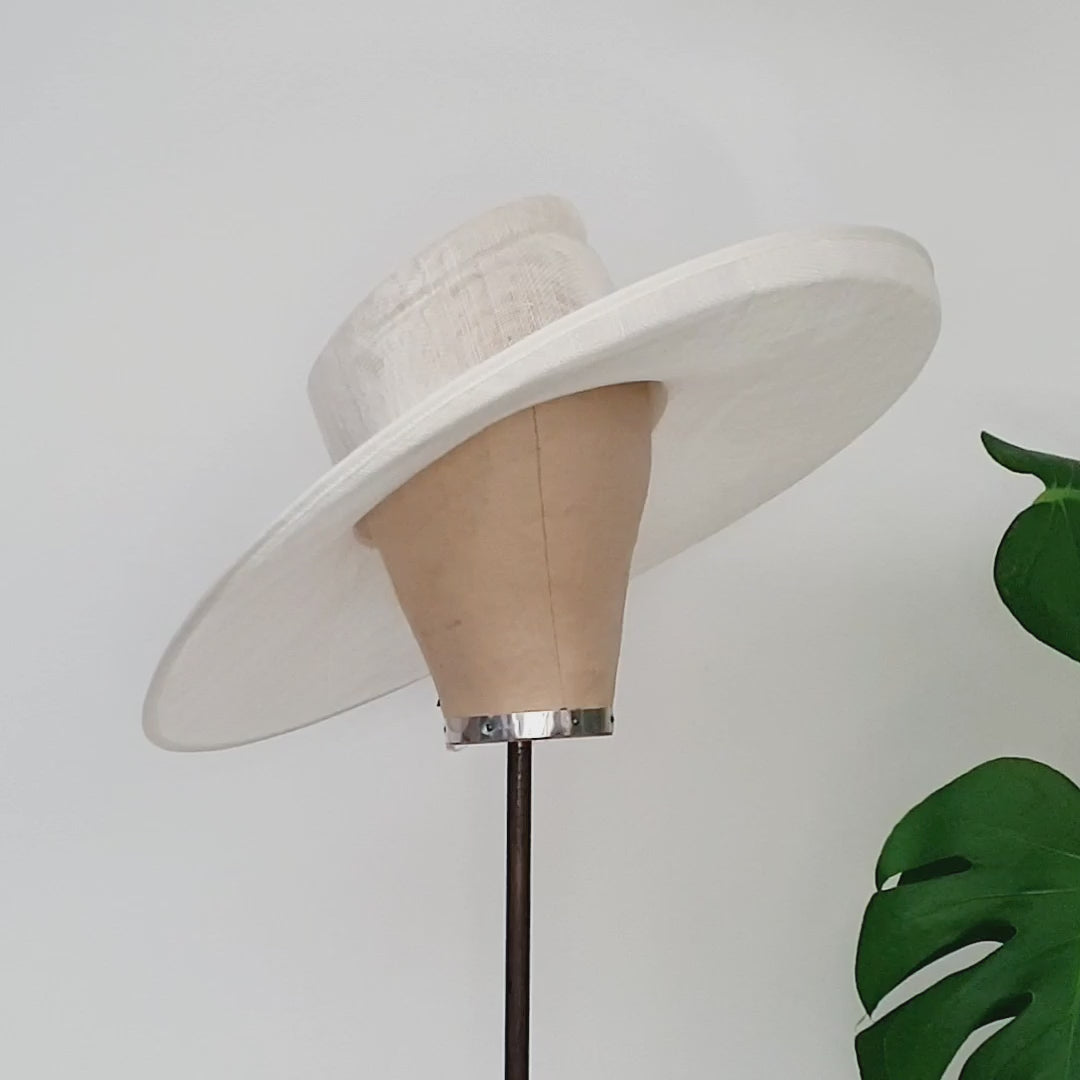 British made premium 3 layer sinamay with sharp brim edge brim with indented slanted crown, wired and turned brim edges, ideal for many fascinators, millinery and hat trims. You will need to add your own headband, comb, clip or elastic to make this fit. Please note these items are bespoke made and are not returnable.