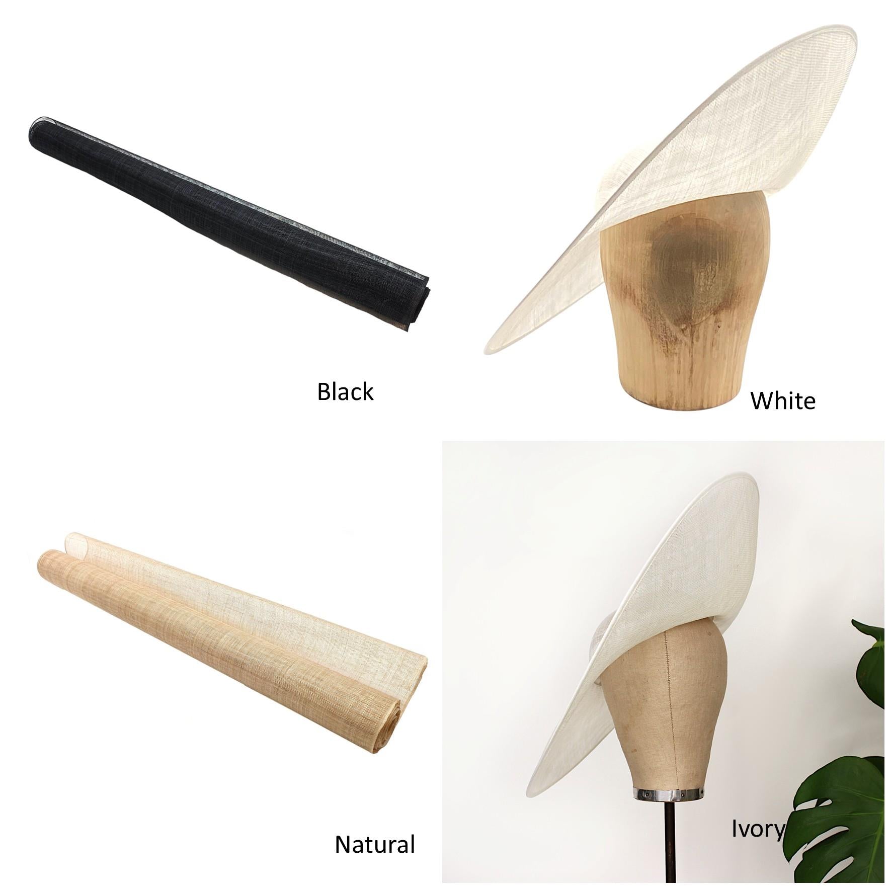 British-made premium 3-layer sinamay side-sweeping hat base with extended brim, rounded crown, and wired, turned brim edges.