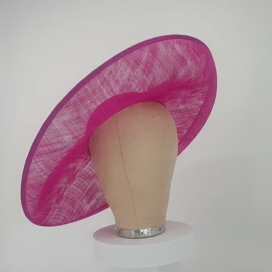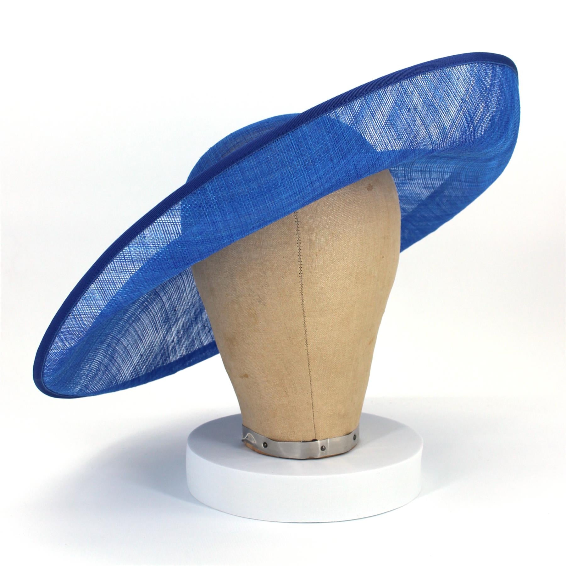 This large sinamay side sweep fascinator base will make an impactful statement at special occasions. The size allows it to be seen from a distance, while the Side Sweep adds a touch of glamour. The fascinator base is a classic design that guarantees a timeless style. This millinery hat base has a diameter of around 42cm and stands about 9cm at its highest.. This fabulous hat base is made in the UK from 2 layers of sinamay and finished with a co-ordinating petersham edge. Measures approximately 43cm at widest points. You will need to add your own headband, comb, clip or elastic to make this fit. Does not come with an inner ribbon band.