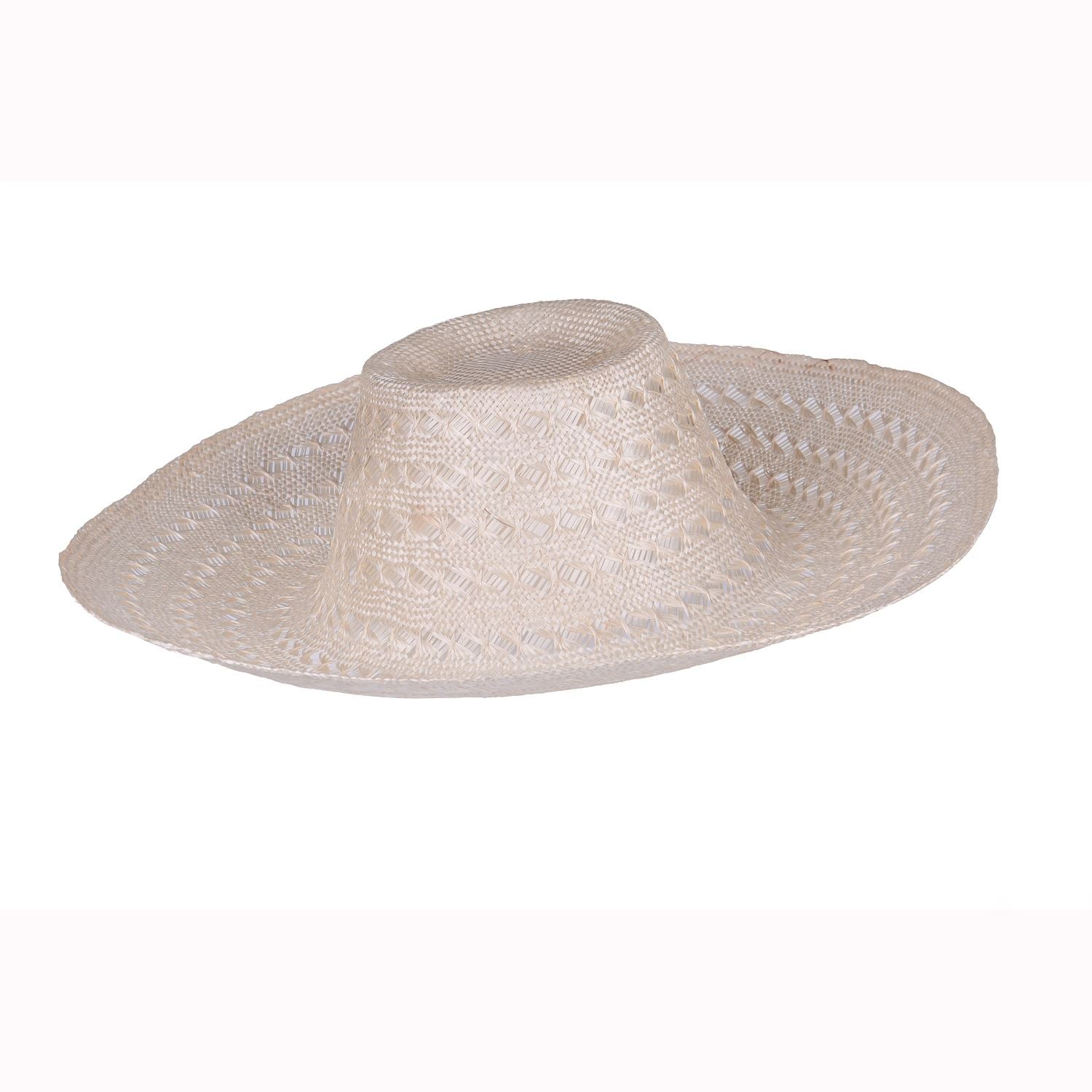 1. 15x12x14cm 2. Patterned weave 3. Ramie straw. Natural in colour this ramie hood is ready for dying and stiffening, or use it in its natural colour. The ramie straw fibres are woven together with cross knot pattern as an integral part of the weave. The pattern runs from the top right to the brim edge. These fancy ramie straw hoods measure approximately 15cm across the crown, 12cm deep with a brim of 14cm